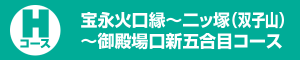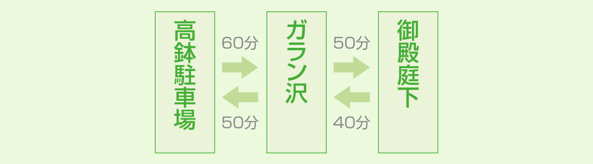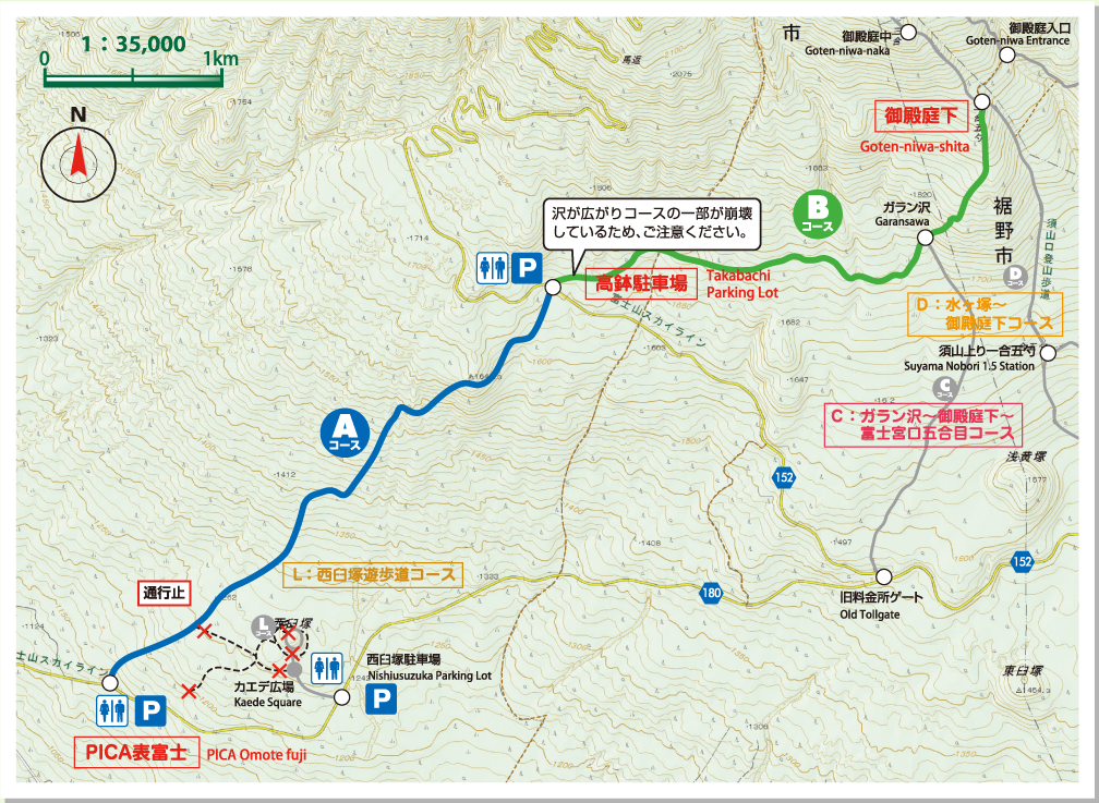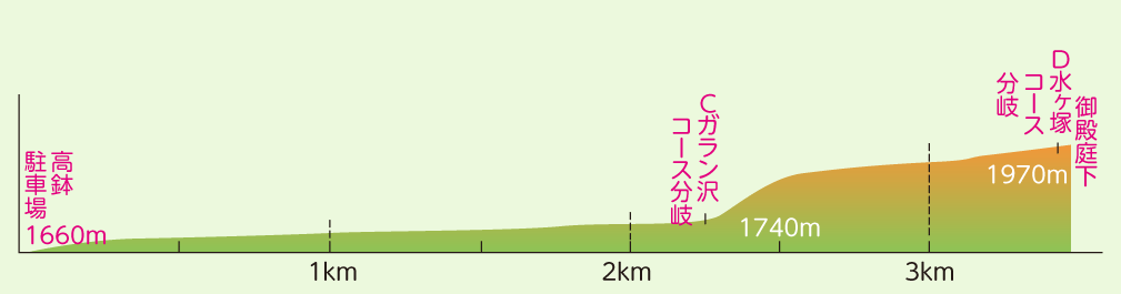 笹が茂り、モミの植林帯やカエデ、ブナ、シラビソなどの原生林が広がる山道を歩く。野原に出たら中ほどで沢筋を横切り、かつて木材の搬出に使われた「木馬(きうま)」のレール道跡を通って、ガラン沢からの山道と合流する。地形は傾斜を増し、右へ左へとカーブした後、尾根の横斜面を直上する。カラマツの低木林の切れ間から富士山山頂を眺めつつ尾根を進むと、水ヶ塚コースとの分岐点、御殿庭下に着く。強風でカラマツが盆栽のような樹形になり、日本庭園風の趣を呈している。