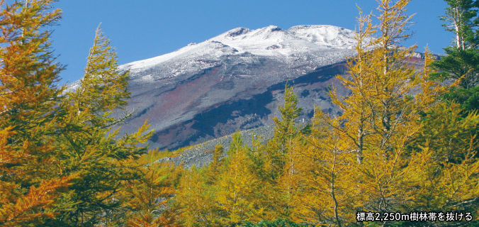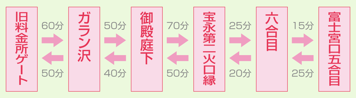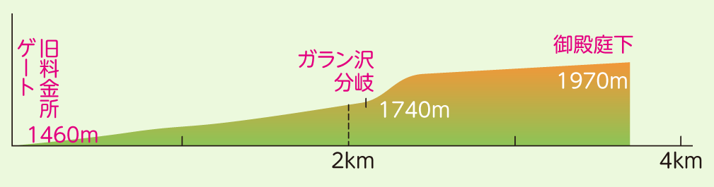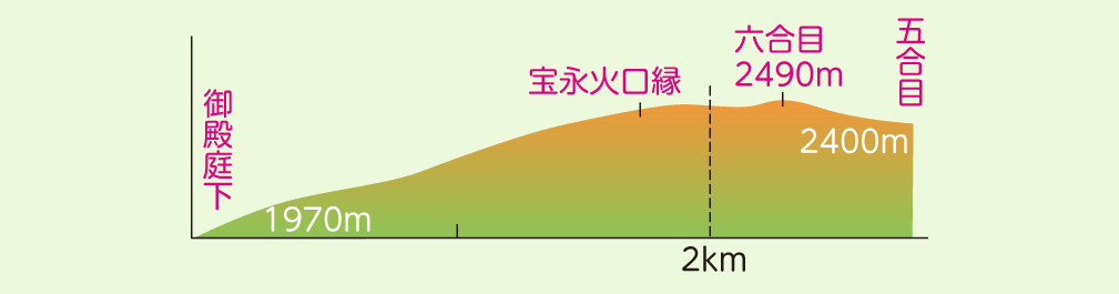 富士山スカイラインの登山区間入口(旧料金所)から御殿庭下、宝永第二火口縁を経て、富士宮口五合目に至るコース。海抜0メートルから富士山頂を目指す「富士山登山ルート3776」のコースでもある。山笹の中の道を歩き、二つの沢を渡ると展望が開ける。広々とした原生林からモミ林帯へと続き、浅い沢沿いに進んだ所で高鉢駐車場からのコースと合流する。カラマツ林の傾斜を登り、尾根に出ると御殿庭である。三つの宝永火口縁の尾根を伝い、第一火口底へと下る道の分岐点で左の山道に進み、六合目を通って富士宮口五合目に至る。