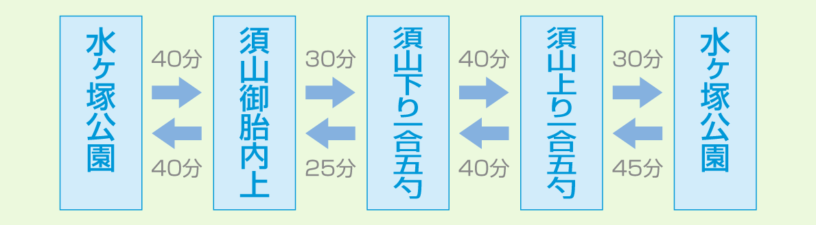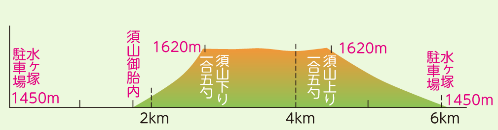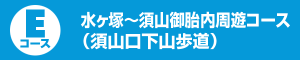 水ヶ塚公園駐車場から富士山スカイラインを横断し、須山口登山道の分岐点を右に折れる。道はヘアピンカーブして、スカイラインと平行に御殿場方向に向かう。植林のモミ林や風倒木帯、ミズナラ、カラマツなどの原生林を過ぎ、沢筋を横切って須山口下山歩道の交差点から2分程で須山御胎内に着く。幕岩に向かう山道を北上し、須山下り一合五勺の分岐で西に向かい、水ヶ塚・御殿庭下コースの須山上り一合五勺に合流。南下して水ヶ塚公園に戻る。
