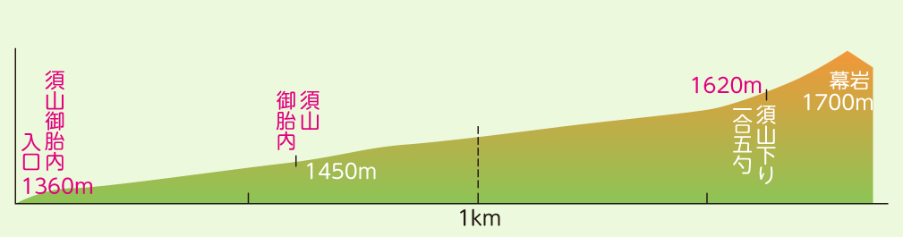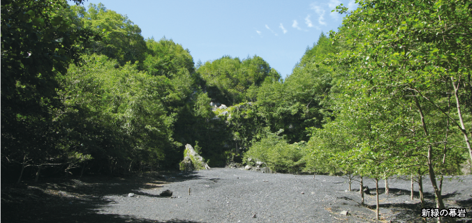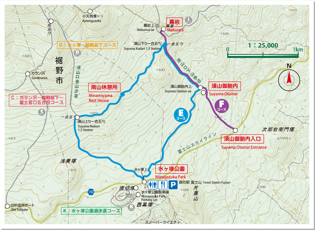 須山下り一合五勺まで進む。尾根の最上部を直進し、御殿場からの双子山周遊コースとの分岐点で右に曲がり、少し下ると幕岩の滝下の広場に出る。岩壁には見えないほど、夏は草木に覆われる。
