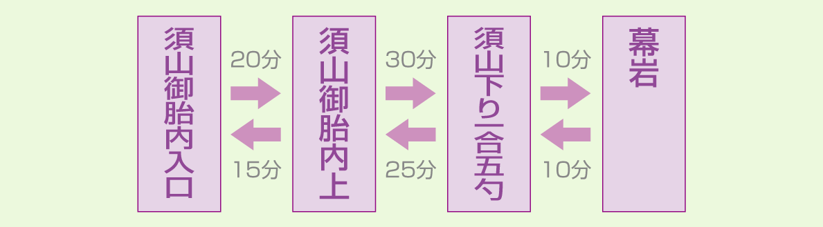 水ヶ塚公園から車で東へ5分。「遊歩道案内図」の看板と3、4台の駐車スペースを目印に、整備の行き届いた林道を富士山頂方面に登って行くと、御胎内の入口に着く。一つ目の風穴を通り抜け、鳥居をくぐるとその先にもう一つの風穴が祀られている。再び山道を北上し、水ヶ塚からの須山御胎内周遊コースと合流して