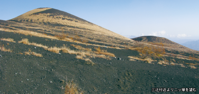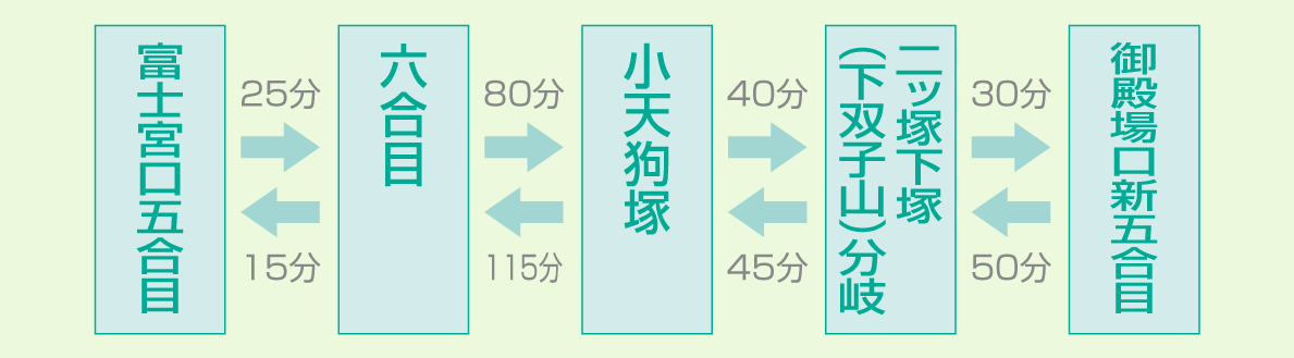 富士宮口五合目から六合目に向かい、小屋の分岐点で宝永火口縁への山道を進む。尾根を下り、第二、第三火口縁の中間で左折。最底部に降り、さらに下ると南東方面に枝を伸ばした旗状樹形のカラマツと出会う。小天狗塚から道は平坦になる。林を抜け、一尾根越すと広大な砂地の世界が開け、双子山の美しい曲線が見える。双子山から山道を直進し、坂道を下れば御殿場口新五合目に到着。尾根を下って駐車場に直行するか、御殿場口登山道と合流し、鳥居をくぐって駐車場に出る。