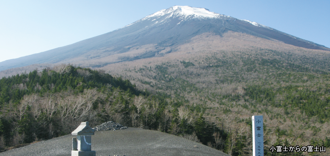 須走口五合目の山小屋から遊歩道に入ると、鬱蒼とした森林地帯が続き、シラビソ、コメツガ、カラマツ、ダケカンバなどの原生林や、多彩な高山植物が生い茂る。20分ほど歩いて樹林を抜けると、そこはもう小富士の山頂。明るい台地が広がり、雄大な富士山の眺望や、山中湖、箱根の山々の景観が楽しめる。星の観測地としても人気が高い。沢沿いには70mに渡って溶岩流の岸壁が伸びる。古御岳神社への参道や、カリヤス草原、まぼろしの滝へと続く遊歩道など、散策スポットも豊富だ。
