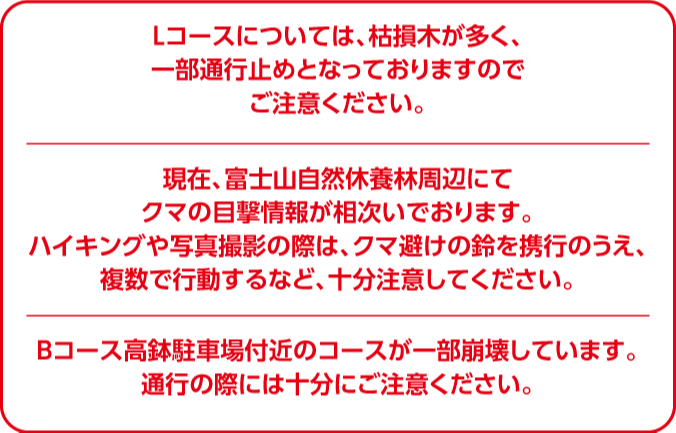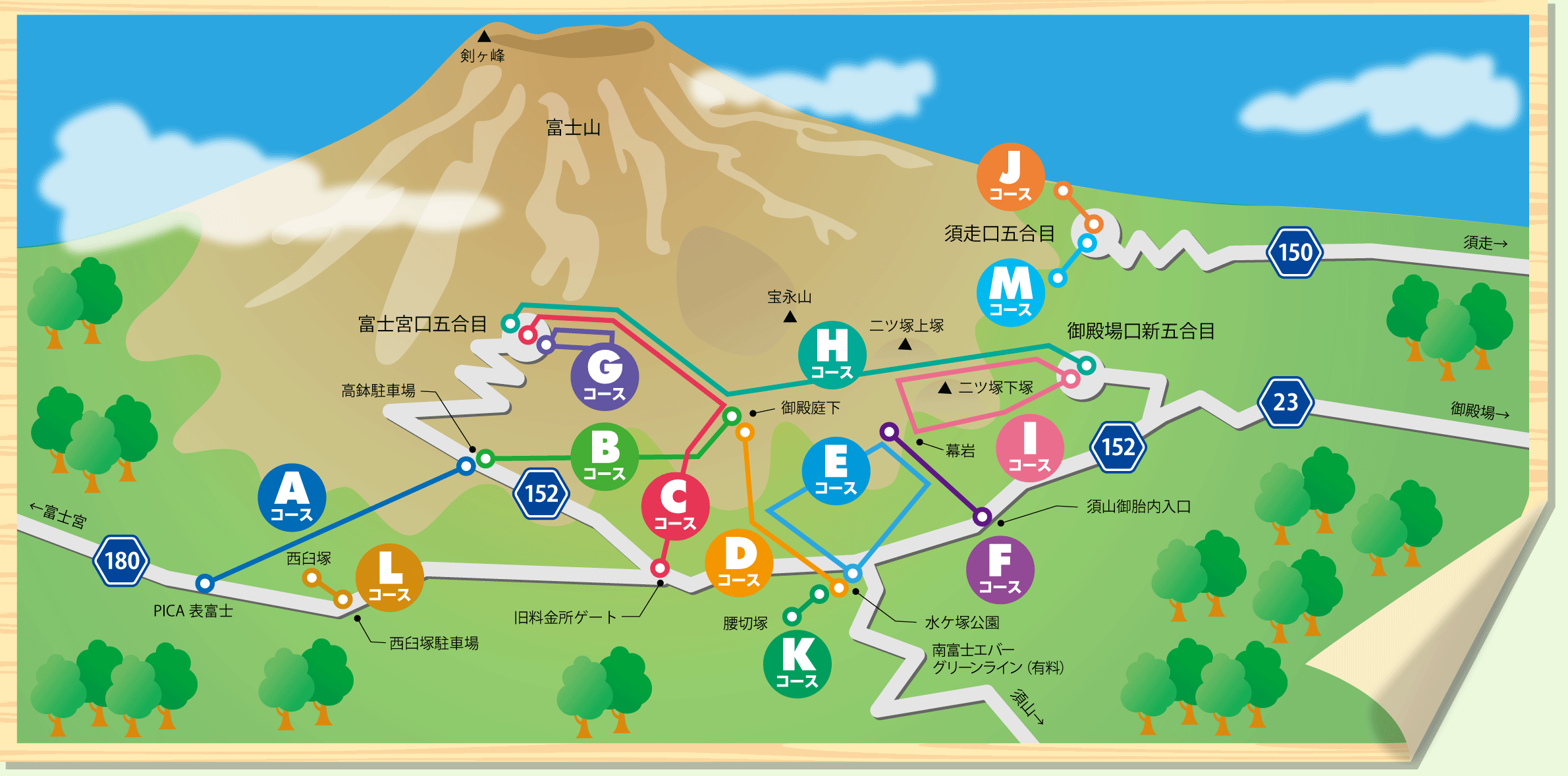 富士山自然休養林ハイキングコースは、二合目から六合目にかけて延びる13のコース。